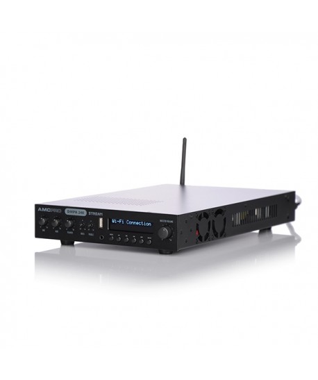Il dispositivo della serie DMPA STREAM è un amplificatore di mixaggio compatto da 1U half-rack per diffusione sonora pubblica, dotato di alimentatore switching e trasformatore di uscita da 100 V. È dotato di un lettore multimediale integrato progettato per lo streaming di stazioni radio internet e musica da servizi popolari come Spotify, Tidal e altri. Il lettore musicale può essere controllato tramite un'app o i comandi del pannello frontale e supporta connessioni Ethernet e Wi-Fi.