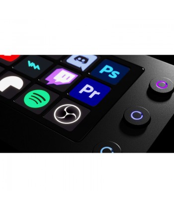 È basata su un display con 15 tasti touch totalmente personalizzabili. Non si è però limitati a questo numero, poiché si possono facilmente scorrere le pagine, fino a 14, per aumentare enormemente il numero di funzioni customizzabili. La prima pagina può essere utilizzata per aprire, al solo tocco di un tasto, un elenco delle App/programmi/macro più utilizzate per il proprio lavoro (ad esempio OBS, Chrome, YouTube, WhatsApp, Spotify, Photoshop ecc.). Nella seconda pagina si possono programmare gli shortcut per lo streaming che ci aiutano a interagire con OBS commutando velocemente fra scene e sorgenti e nella terza pagina programmare gli effetti sonori. Oltre al display, troviamo sulla sinistra una coppia di encoder rotativi, che reagiscono anche alla pressione, ideali per regolare il volume dell’audio (per esempio quello dei microfoni o dei giochi, attivare il muting), fare lo zoom IN/OUT delle applicazioni o lo scrolling delle pagine web. A queste si aggiungono quattro pulsanti per i comandi essenziali o per accedere a certe pagine specifiche senza swappare sul display, o ancora attivare le macro.