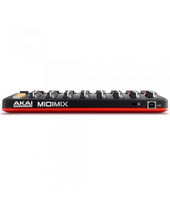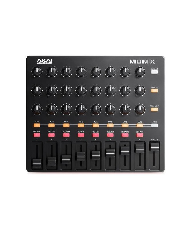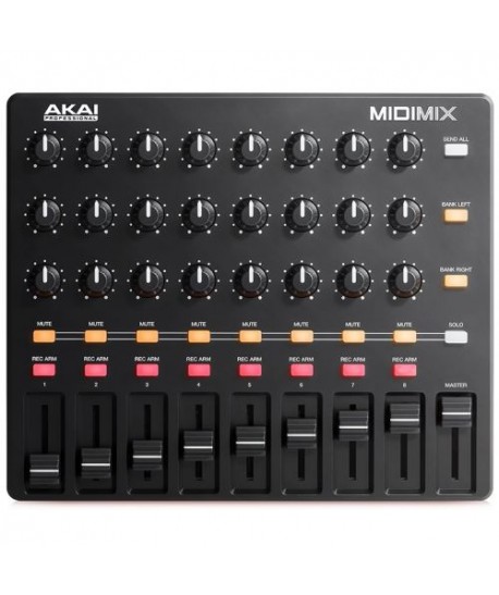 Akai Professional MIDIMIX è un MIDI USB controller che si propone con un layout in stile mixer tradizionale, con 9 fader (8 di canale e uno master) e 24 potenziometri rotativi (3 su ciascuno degli 8 canali), pensato per la gestione dei software DAW, in particolare per Ableton Live con il quale si interfaccia automaticamente in modalità control surface, al fine di consentire una gestione dinamica del controllo dei tuoi progetti. Estremamente portatile e leggero, ma ricco di potenziometri rotativi e fader, AKAI Professional MIDIMIX tornerà comodo anche a chi effettua live performance, in quanto potrà mapparlo a suo piacimento sfruttando le funzionalità MIDI Learn disponibili in ormai tutti i software audio/MIDI, nei virtual instruments, o nei programmi di mixaggio DJ: da Virtual DJ a Traktor Pro, da Serato DJ a Logic Pro, etc.