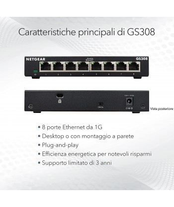 Lo switch Gigabit a 8 porte NETGEAR è uno switch ideale per la rete di casa o piccoli uffici domestici. Si connette automaticamente al tuo router o modem utilizzando qualsiasi porta. Con il suo case elegante, il funzionamento silenzioso e la configurazione plug-and-play, è perfetto per qualsiasi rete.