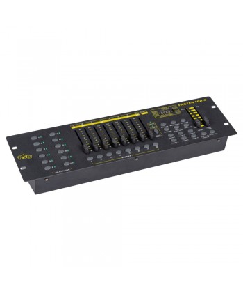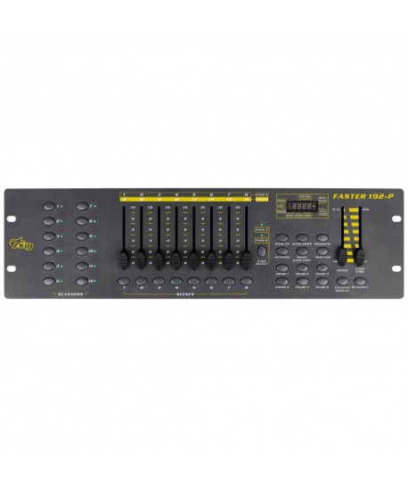 Faster 192 è un'unità di controllo semplice ed intuitiva per scanner e motorizzati, E' un controller DMX dalle dimensioni compatte, disegnato appositamente per gestire fino a 12 proiettori con funzionamento fino a 16 canali ciascuno. La console permette di personalizzare i programmi e le scene interne e memorizzarle fino ad un massimo di 184 scene e 6 chase su 23 diversi banchi.