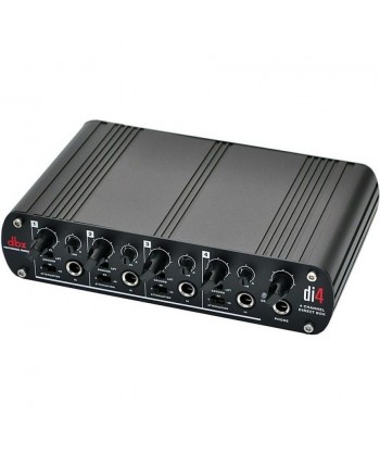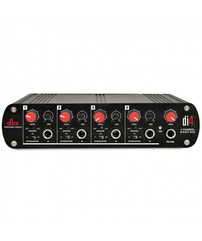 La Di4 a 4 canali è progettata per essere utilizzata come strumento standard per molte applicazioni audio. Poichè offre quattro canali, la Di4 risolve facilmente il problema della conversione di segnali sbilanciati in segnali audio in uscita bilanciati adatti per l'uso con mixer, amplificatori, console di registrazione ed altro ancora. La Di4 funziona anche come mixer di linea stereo multicanale. Questa funzione consente di collegare tutte le tastiere, i campionatori e i moduli ad un'unica unità rack sul palco, e fornire uscite bilanciate XLR indipendenti allo stage box per un tecnico front of house e impostare il tuo mix per il monitoraggio sul palco. La Direct Box DBX Di4 offre anche un'uscita per cuffie.