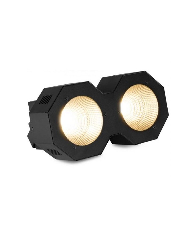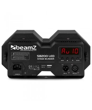 SB200 Stage Blinder è un potente apparecchio per l'illuminazione a LED con un design robusto dotato di 2 LED da 50W Chip-on-Board (COB) che unisce due effetti. Oltre a uno stage blinder, questo dispositivo può anche essere usato come stroboscopio. L'SB200 combina l'emissione luminosa abbagliante di un Audience Blinder convenzionale e può essere controllato in modalità standalone, attivazione sonora o direttamente tramite DMX in una modalità a 6 canali. I LED hanno un'aspettativa di vita di 100.000 ore. Il colore dei LED è bianco caldo.