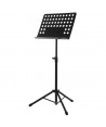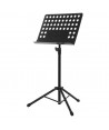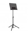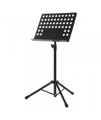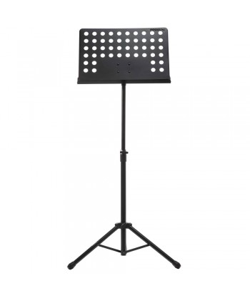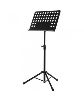 Leggio professionale con appoggia spartiti preforato orientabile progettato per sostenere carichi notevoli. Nuovo sistema di bloccaggio antiscivolo per garantire una regolazione veloce dell' altezza e ampia base tripoide. Disponibile in due modelli: struttura in acciaio con finitura in nero opaco e borsa in nylon (RSM360M) e senza borsa in nylon (RSM360WOB).