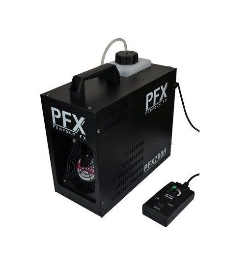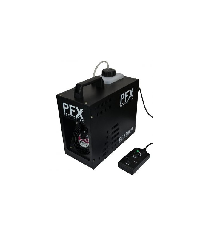 Una macchina portatile e potente, perfetta per l'intrattenitore mobile. Emette una nebbia di fumo nell'aria per sfruttare al massimo le luci e i laser. Fornito con un semplice telecomando a mano. Un' unità che incorpora una caldaia da 700 watt, un serbatoio del liquido da 1,2 litri e una pompa affidabile. PFX700H ha una speciale funzione di auto-cleaner incorporata che pulisce automaticamente la caldaia dopo l'uso, per prolungarne la durata. Utilizza liquido tradizionale a base di acqua (mai a base di olio).