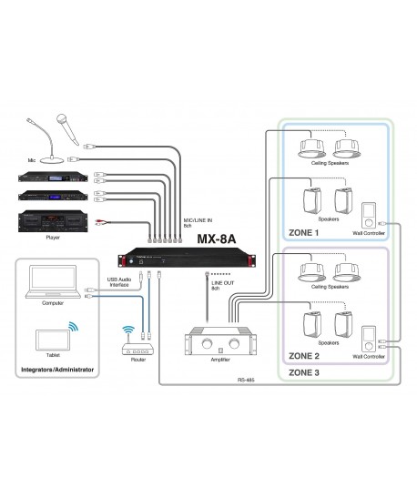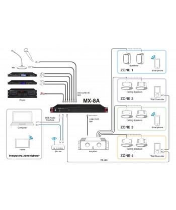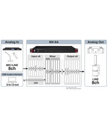 L'MX-8A è un mixer a matrice 10×10 con otto ingressi mic/linea, otto uscite di linea e I/O USB stereo compatibile con sistemi di conferenza basate su software o cloud. DSP interno con potenti funzioni di missaggio e routing oltre a molteplici funzioni di elaborazione audio ed è ideale per molte applicazioni tra cui sale riunioni, spazi ristretti, aule giudiziarie, ristoranti, negozi, sale per banchetti e altro.