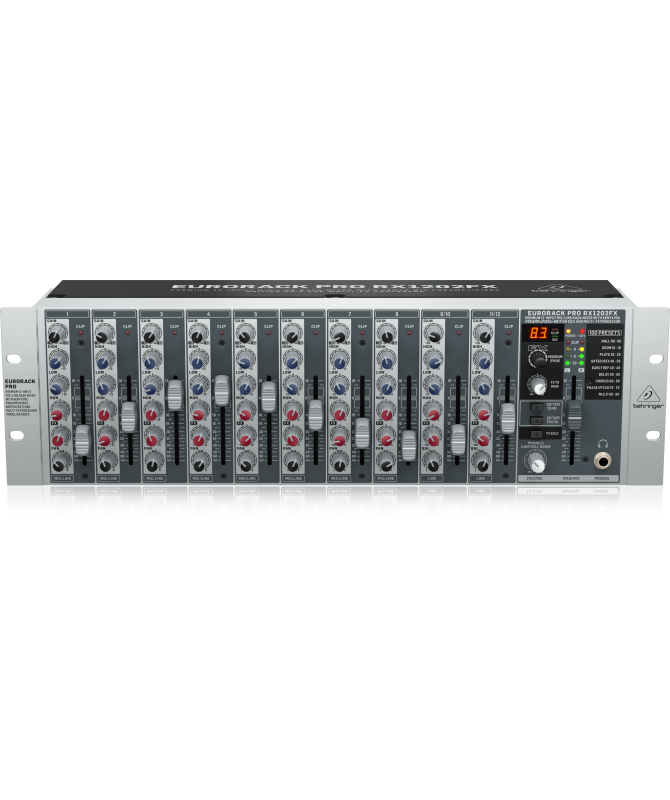 Il mixer RX1202FX a 12 ingressi montabile a rack consente di ottenere senza sforzo un suono di qualità superiore, grazie a 8 preamplificatori microfonici da studio Xenyx integrati, 2 ingressi di linea stereo ed EQ del canale "British" ultra-musicali. Aggiungi a questo il processore Behringer Multi-FX a 24 bit con 100 fantastici preset tra cui riverberi, delay, pitch shifter e vari multieffetto da studio - e l'RX1202FX diventa un mixer incredibilmente versatile per le tue esibizioni dal vivo. Ideale per musicisti e per un'ampia varietà di applicazioni aziendali, il Behringer RX1202FX è perfetto anche per il sub-mixaggio di tastiere, batteria o microfoni per voce multipli - ed è un "must-have" assoluto per monitorare i tuoi progetti di registrazioni multitraccia.