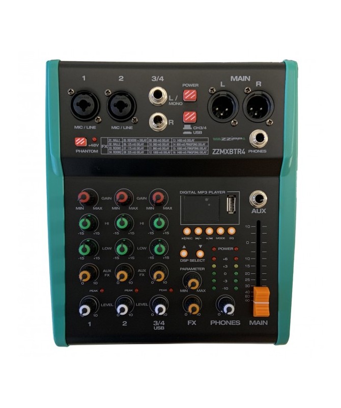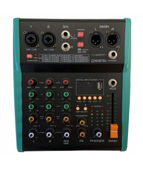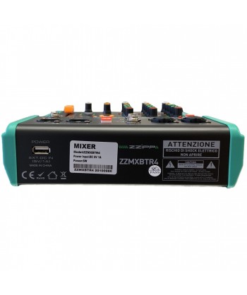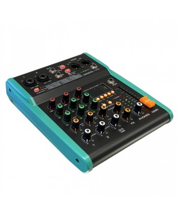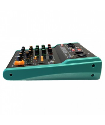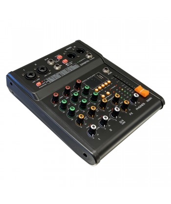 Mixer compatto con lettore mp3 integrato, connettività bluetooth e scheda audio.