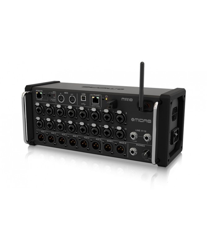 Il mixer Midas M32 ha completamente ridefinito il concetto di "mixer digitale" e ancora oggi centinaia di utenti possono testimoniarne la versatilità e le capacità. Nel corso degli ultimi anni il mondo della registrazione ha subito un’evidente virata dettata dalle nuove tecnologie nel campo dei mixer digitali, richiedendo sempre più flessibilità e intuitività. Il Midas MR18 è un mixer portatile con 18 ingressi e 8 bus racchiusi in un design compatto da stage box. È l'ideale sia per le situazioni live, che per lo studio, grazie alla sua operatività congiunta ai tablet iOS e Android. Comprende ben 16 ingressi con i celebrI preamp Midas PRO, router WiFi integrato per il controllo remoto, MIDI I/O e interfaccia audio USB bidirezionale. Le applicazioni gratuite per iOS, Android e PC ti permetteranno di allontanarti dal banco e controllare a distanza i parametri oppure permettere agli artisti di regolare automaticamente il livello dei monitor.