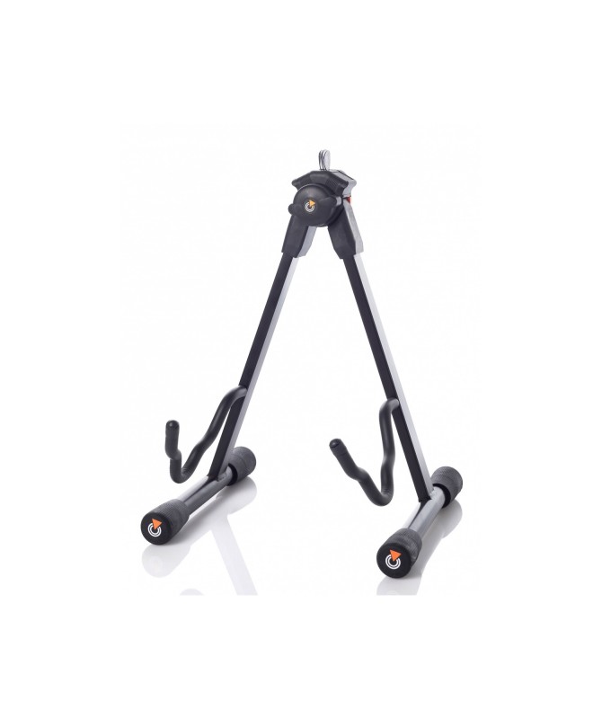 Supporto "A-style" universale per chitarra e basso con regolazione infinitesimale dell'apertura. Manopola di regolazione e bracci di appoggio rivestiti in gomma naturale per garantire l'incolumità dello strumento e per evitare reazioni chimiche con la verniciatura dello stesso. Blocco superiore in nylon caricato con alloggio per tre plettri (inclusi). Piedini in gomma autolivellanti.