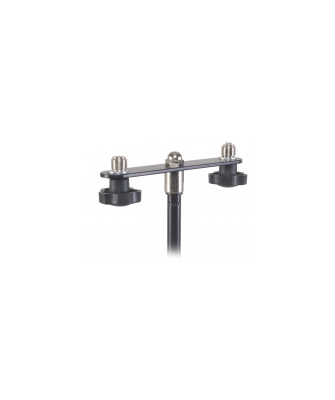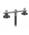 Supporto in acciaio con aggancio per due supporti microfonici, da utilizzare su aste microfoniche. Lunghezza: 180 mm.