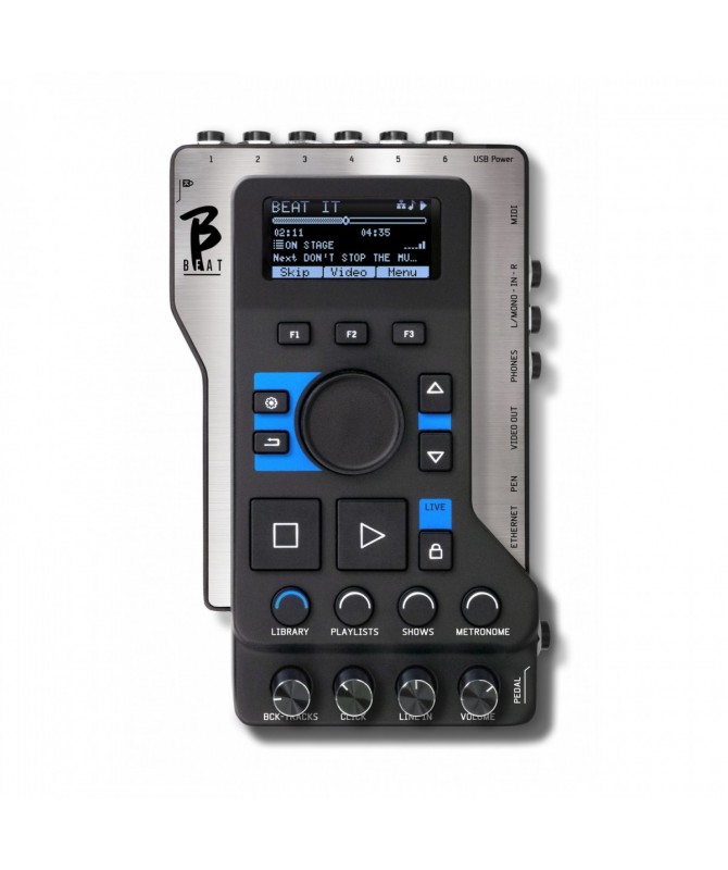 B.Beat è la soluzione ideale per gestire le sequenze sul palco: lo colleghi al mixer, indossi la tua cuffia, premi play e via. Con B. Beat controlli il volume del Click e delle varie fonti sonore. Legge MP3, Wav, Stems, MTA e progetti audio fino a 16 tracce mono oppure 8 tracce stereo. Legge Video o JPG sincronizzati con la musica. Ha un mixer digitale con 6 uscite separate per le tracce. Ha due ingressi per ricevere, ad esempio, un ritorno dal mixer e con 4 potenziometri il musicista bilancia autonomamente gli ascolti in cuffia.